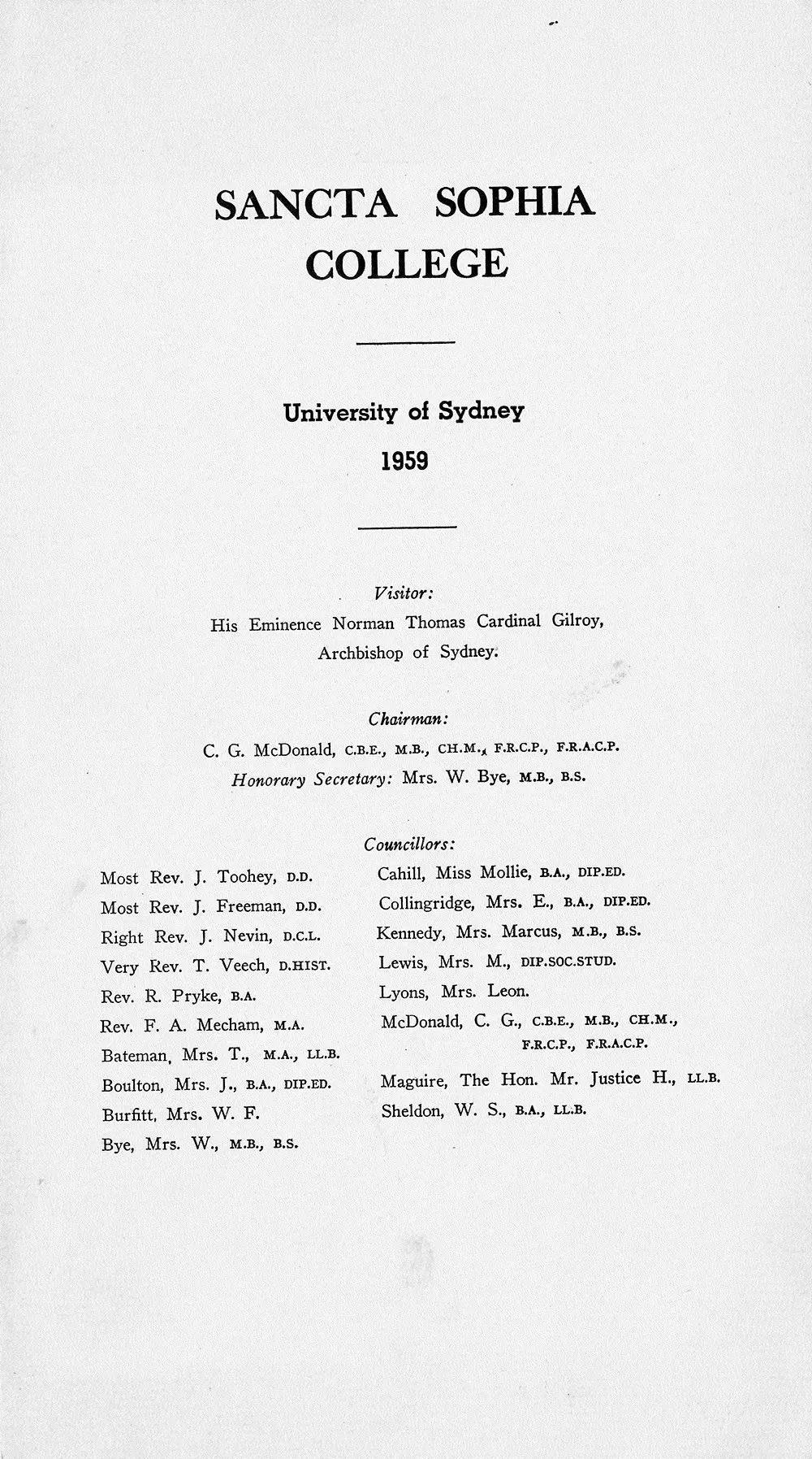 1956 – this year was marked by the deaths of five of the College’s Foundation Councillors: His Lordship Bishop Gleeson, the first Chairman, Dr Walter Burfitt, Mrs Anne Spruson, Sir Mark Sheldon and Dr Mary Burfitt Williams, all of whom had made significant contributions to the development of Sancta Sophia College.
