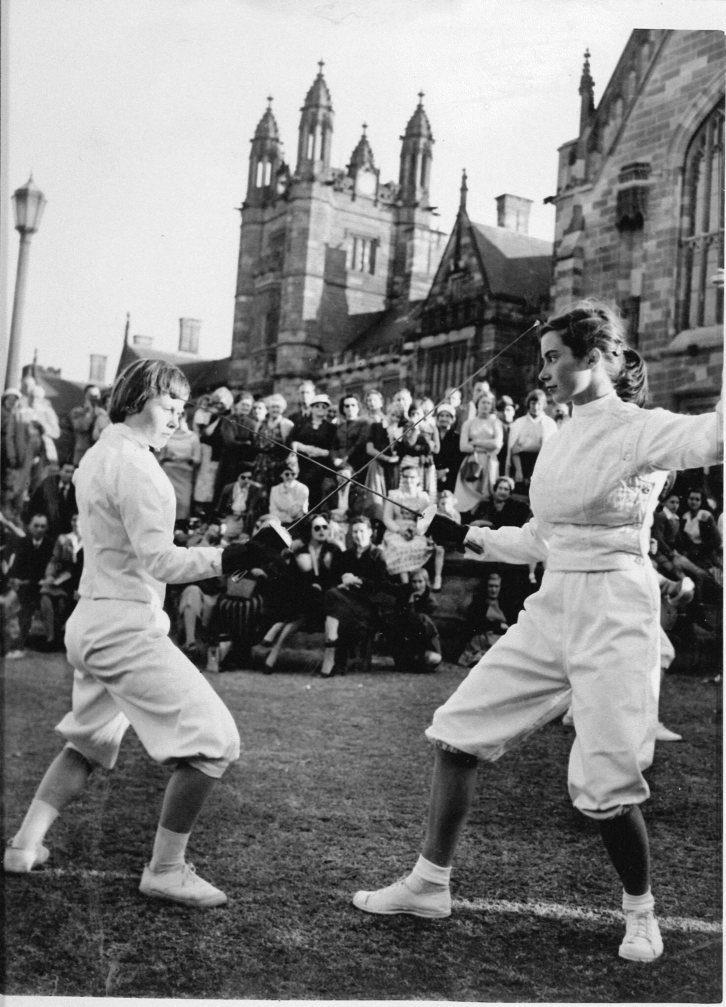 Fencing exhibiiton Settlement Fete 1957, Mary Nathan and Deborah Bruce