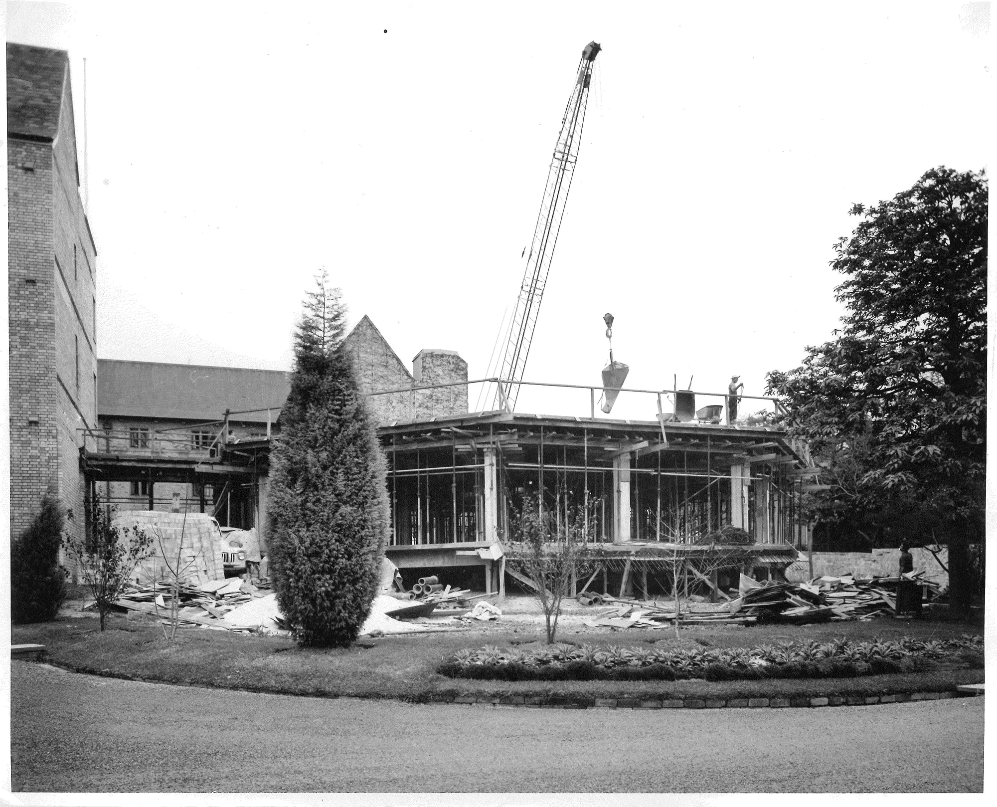 1959 – At the meeting of 5 March, Council was advised that the architect had been asked to draw up plans for a proposed extension to the College, including “a main entrance hall and staircase, a reception room, a large lecture hall to be used for tutorials, sleeping accommodation for about thirty two students, bath room block ad extensions to the Chapel and Library”. Work finally commenced on the extension on 21 December.