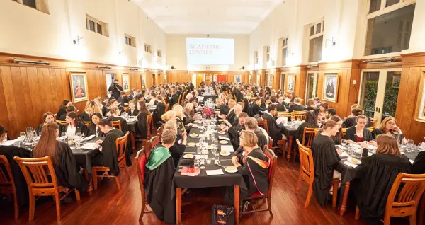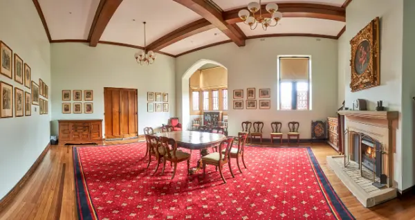 The Lower Common Room is a large heritage space with a refined look and feel. Ideal for almost any event style, the space offers high ceilings, polished timber floorboards, a grand piano, stained glass windows, a sandstone fireplace and refined, comfortable furnishings. The room can be split into two via a large sliding door in the middle.
